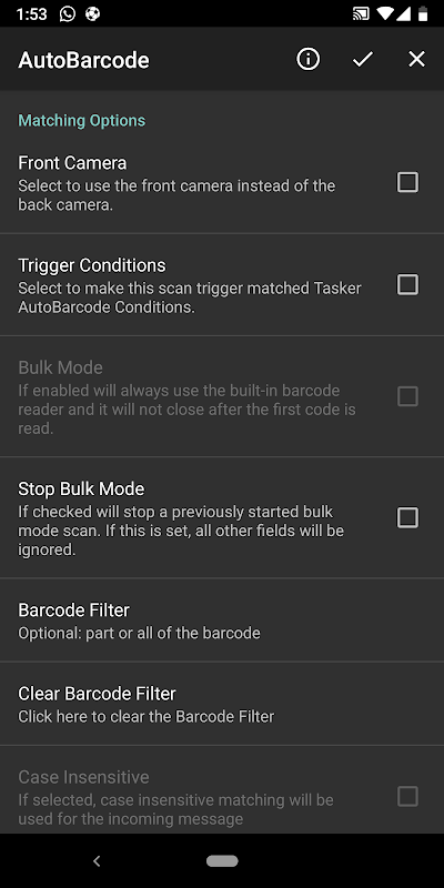 - AutoBarcode là cách nhanh nhất để cho Người thực hiện biết bạn đang ở một địa điểm cụ thể nếu không có wifi hoặc bạn không muốn hoặc không thể sử dụng wifi (công việc, xe hơi, phòng ngủ cụ thể trong nhà bạn). Ví dụ: chuẩn bị sẵn mã QR trên bảng điều khiển trên xe của bạn. Khi bạn đến đó, chỉ cần quét mã và Tác vụ có thể bắt đầu phát các bài hát yêu thích của bạn với âm lượng được bật lên, đồng thời mở google maps để chỉ cho bạn đường đi.