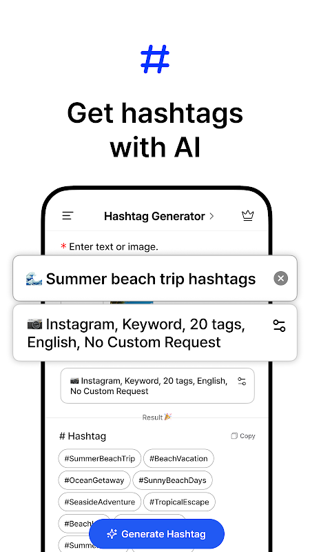 Nhập từ khóa hoặc tải lên hình ảnh, AI sẽ ngay lập tức đề xuất các hashtag được tối ưu hóa. Chọn từ hơn 10 tùy chọn tùy chỉnh.