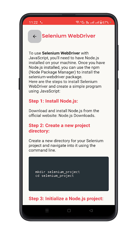 Ứng dụng này bao gồm một chương trình giảng dạy có cấu trúc được chia thành các mô-đun, giải quyết các khía cạnh chính của thử nghiệm tự động hóa. Từ các nguyên tắc cơ bản về kiểm thử phần mềm đến tự động hóa ứng dụng di động, bạn sẽ đạt được các kỹ năng thực tế bằng cách sử dụng các công cụ tiêu chuẩn ngành như Selenium, Mocha và Appium.