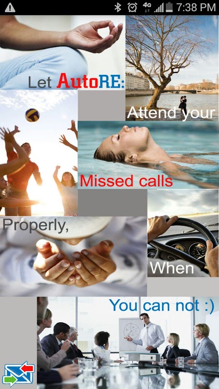 With AutoRe you can reply to calls you don't have time to answer, with a personalized message for free. Whether you're driving, in a meeting, watching a movie, playing basketball or just being plain busy