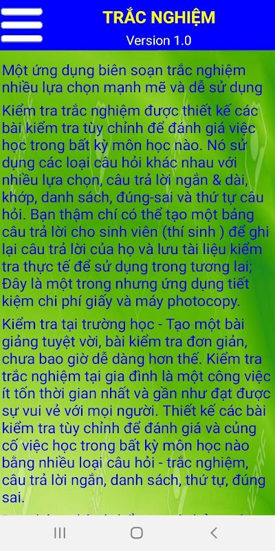 Bảng tính biên soạn câu hỏi, "TRẮC NGHIỆM" có dung lượng rất bé, không ảnh đến bộ nhớ trong của điện thoại, chính vì vậy phải khẳng định rằng: