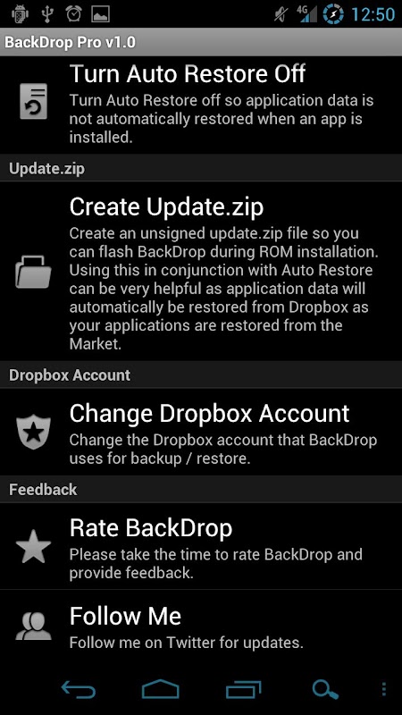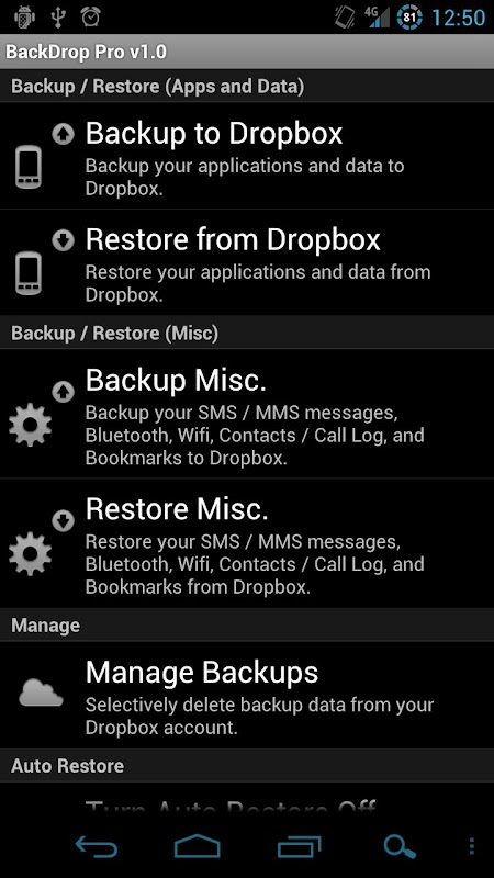 * Auto Restore (automatically restore your application data from Dropbox when an application is installed).