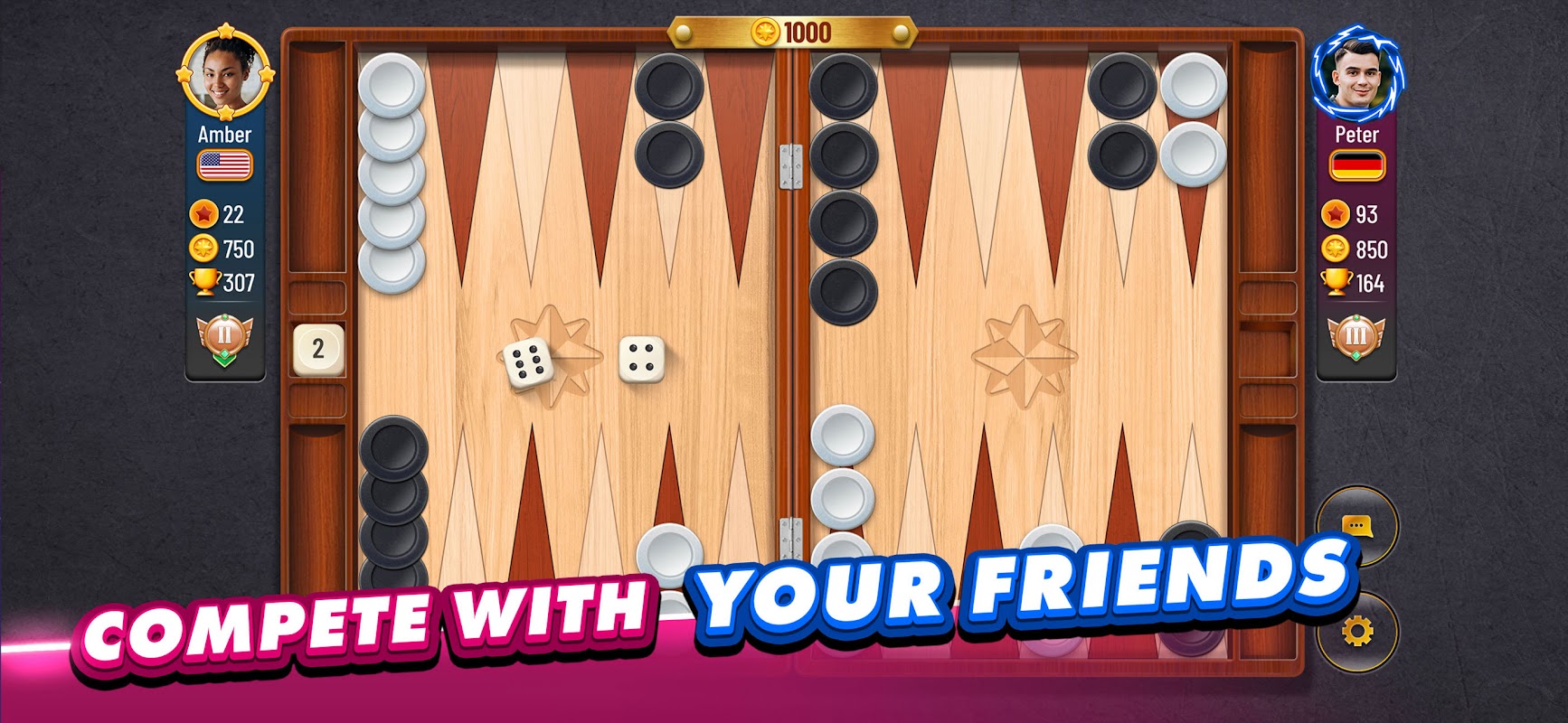 Thách thức bạn bè hoặc tìm đối thủ trực tuyến để chơi trò chơi hai người chơi ly kỳ. Backgammon sẽ tuyệt nhất khi chơi cùng một đối thủ xứng tầm.