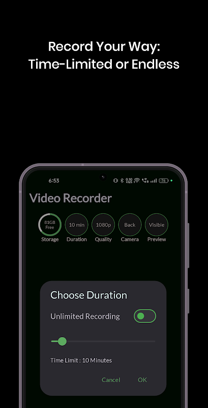 Ứng dụng này được thiết kế cho các trường hợp sử dụng hợp pháp như bài giảng, phỏng vấn, tài liệu công việc, ghi hình hiện trường, thu thập nội dung và kỷ niệm cá nhân — với hoạt động ghi hình minh bạch (quá trình ghi hình sẽ chạy kèm thông báo liên tục khi Android yêu cầu).