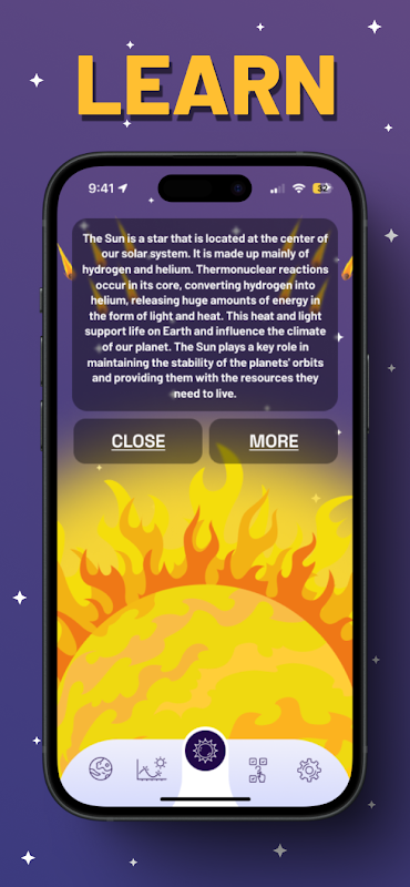 On the Sun screen, you can see a realistic visualization of the star and its impact on the entire solar system. Learn what the Sun is made of, how thermonuclear reactions occur, and why solar flares are important to Earth.