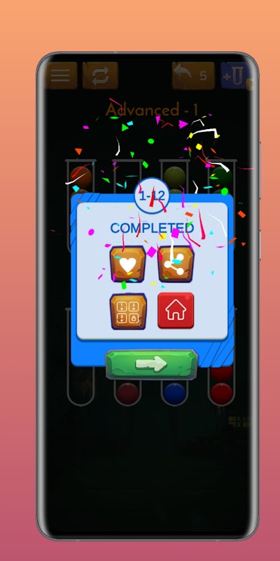 1. Chạm vào bất kỳ ống nào để di chuyển quả bóng lên trên nó, sau đó chạm vào một ống khác để kết hợp các quả bóng cùng màu.