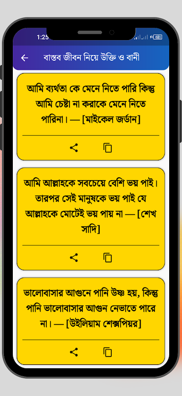 Tất cả trạng thái, trích dẫn và chú thích Bangla của ứng dụng của chúng tôi đều rất ấn tượng. Vì vậy, bạn có thể sử dụng nó rất dễ dàng ở mọi nơi.
