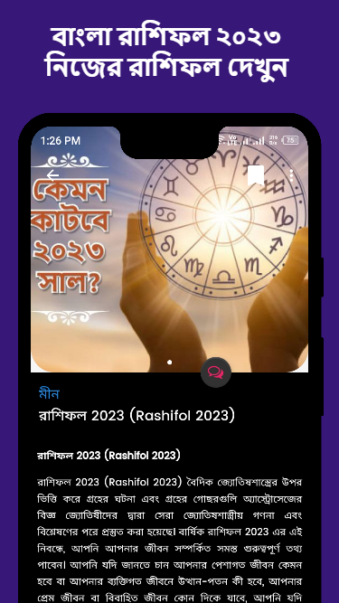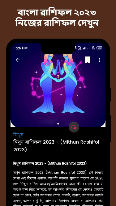 Bangla Rashifal 2023 với tử vi hàng ngày hoặc Rashifal tiếng Bengal là một ứng dụng Chiêm tinh mang đến cho bạn Tử vi hàng ngày của Bangla, dự báo hoặc dự đoán Rashifal hàng ngày, Rashifal hàng năm, lịch hàng ngày và hàng tháng với panjika bằng ngôn ngữ tiếng Bengal. Ứng dụng này hiển thị lịch hàng tháng của Lịch Bangla theo cách tính tháng của người Bengal. Ứng dụng Chiêm tinh này có thể được người dân Bengal trên khắp thế giới sử dụng làm tài liệu tham khảo hàng ngày. Ứng dụng này giúp xác định giờ tốt, giờ xấu, ngày tốt, v.v. Những dự đoán chiêm tinh ở Bangla này được chuẩn bị bởi các nhà chiêm tinh nổi tiếng đủ tiêu chuẩn cung cấp dịch vụ chuyên nghiệp ở Tây Bengal. Ứng dụng tham khảo hàng ngày này giúp cung cấp thông tin hữu ích trong ngày cùng với Rashifal.