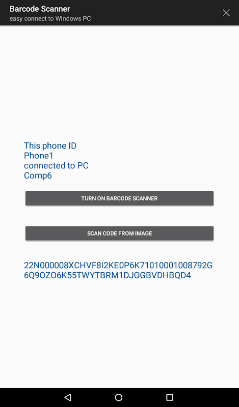 Hỗ trợ kết nối với máy tính Windows và khả năng chuyển mã đã quét sang bất kỳ ứng dụng đang hoạt động nào và trường nhập mở trên máy tính Windows. Thay thế phần mềm máy quét mã vạch. Hai cách để kết nối điện thoại và máy tính. Giao thức TCP / IP nếu thiết bị Android và máy tính Windows trong cùng một mạng cục bộ. Sử dụng giao thức HTTP nếu các thiết bị được đặt trong các mạng khác nhau, chẳng hạn như điện thoại được kết nối với mạng di động của nhà khai thác và máy tính với mạng cục bộ của doanh nghiệp.