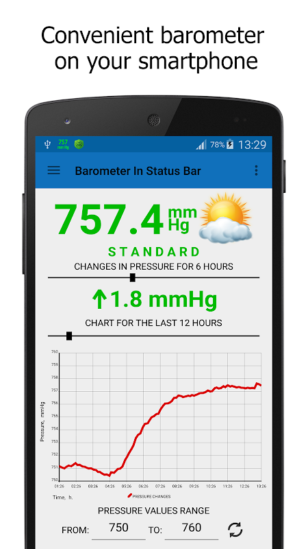 Tính năng chính của ứng dụng là hiển thị áp suất không khí trên thanh trạng thái của thiết bị.
