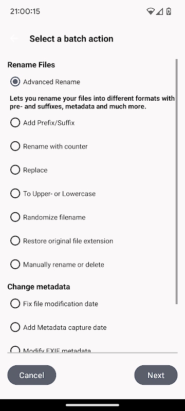 Đổi tên nhiều tệp cùng lúc bằng các định dạng có thể tùy chỉnh, bao gồm dấu thời gian và siêu dữ liệu.