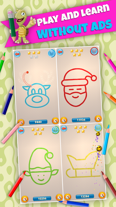Trò chơi học tập này sẽ dạy trẻ cách vẽ đúng bằng cách làm theo các nét vẽ hoạt hình từng bước với nhiều màu sắc khác nhau.