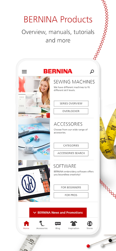 Làm cho việc may vá di động như bạn đang làm với Ứng dụng BERNINA tất cả trong một. Khám phá toàn bộ phạm vi sản phẩm và xem tổng quan về các phụ kiện mà bạn đã sở hữu hoặc muốn mua. Tìm cửa hàng gần bạn nhất hoặc thông tin hỗ trợ bạn cần. Lấy cảm hứng và chia sẻ tình yêu may vá trong cộng đồng blog của chúng tôi.