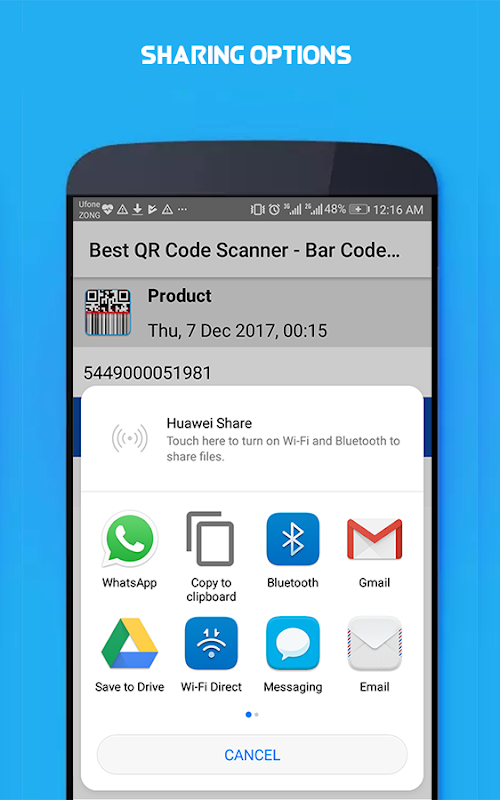 3- Sharing options: It has sharing options which allow users to share scanned result after scanning with qr reader.