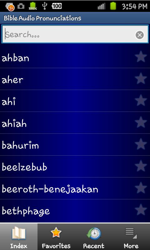 Ứng dụng này có chứa các bản ghi âm âm thanh hữu ích của một số từ khó khăn nhất của Kinh Thánh. Sử dụng nó cùng với của bạn đọc Kinh Thánh để tăng cường sự hiểu biết và thưởng thức của bạn.
