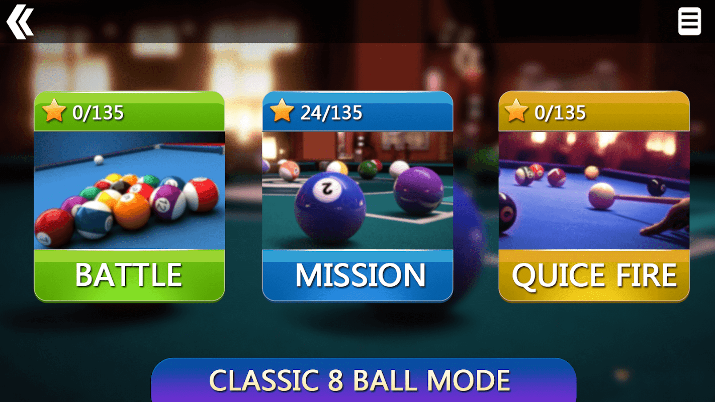 Fast game mode: Quickly start a 9-ball game. You need to hit as many balls in the hole as possible within two minutes. You can get an additional ten seconds for each ball you hit. See the last you Can hit a few balls;