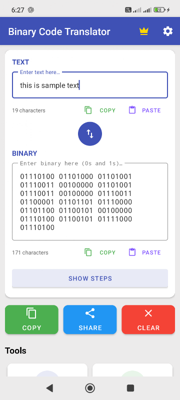 • Sao chép, Chia sẻ & Hoán đổi — Sao chép văn bản hoặc đầu ra nhị phân vào clipboard, chia sẻ kết quả với các ứng dụng khác và hoán đổi trường đầu vào/đầu ra chỉ với một lần chạm.