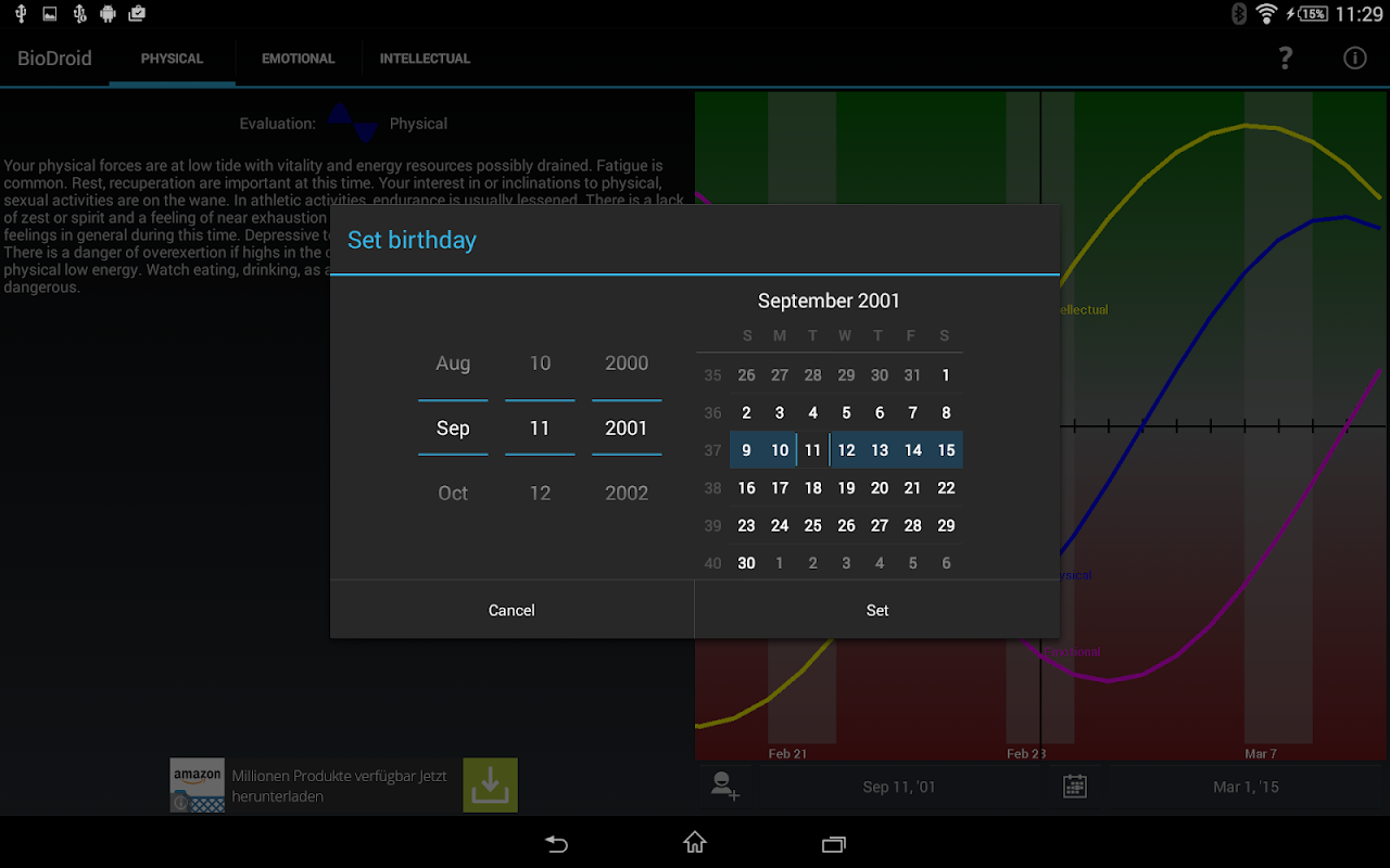 BioDroid determines your being for any day in your life using the theory of biorhythms for the physical, emotional and intellectual strength.