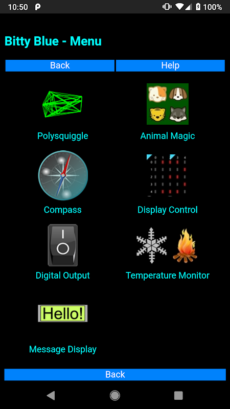 Bitty Blue provides a collection of fun things to do with a BBC micro:bit (or compatible device) and Bluetooth. Play with 3D "PolySquiggles", use your micro:bit as a compass, have fun with the micro:bit's buttons, design patterns and send them or text to the micro:bit LED display and monitor the temperature. Lots of fun and educational too!