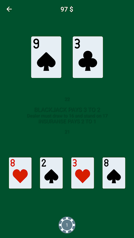 Blackjack sử dụng bộ bài 52 lá. Người chơi Blackjack không thi đấu với nhau. Trò chơi là một trò chơi so bài, trong đó mỗi người chơi sẽ đấu với nhà cái. Mục tiêu của trò chơi là thắng tiền bằng cách tạo ra tổng điểm cao hơn tổng điểm của nhà cái nhưng không quá 21, hoặc dừng lại ở tổng điểm với hy vọng nhà cái sẽ bị bù. Các lá bài số được tính theo số của chúng, quân J, Q và K được tính là 10, và quân Át được tính là 1 hoặc 11 tùy thuộc vào việc tính là 11 có dẫn đến bị bù hay không. Nếu một người chơi vượt quá 21 điểm, họ sẽ bị bù và tự động thua. Tổng điểm 21 trên hai lá bài ban đầu được gọi là blackjack và là bài mạnh nhất.