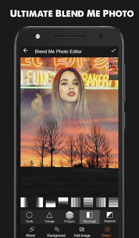 Blend Me Photo Editor is an application to mix two images with blend effect and shape overlay. You can also Mix multiple picture at the same time.