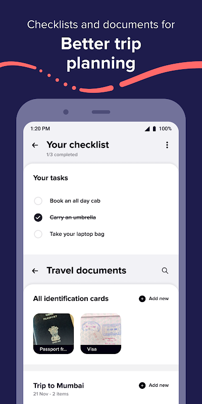 Với ứng dụng lập kế hoạch chuyến đi của chúng tôi, bạn có thể tải lên một cách an toàn tất cả các tài liệu du lịch của mình để đặt chỗ trong nước và quốc tế.