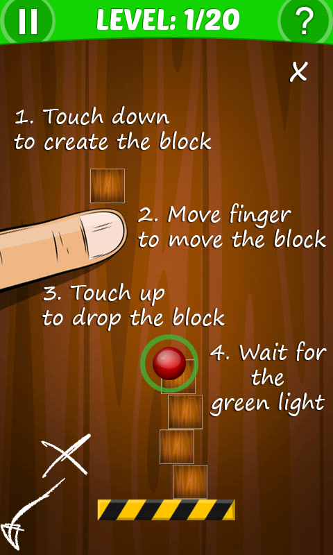 This is a very addictive and difficult game. Your goal is construct tower of blocks to change the red light to the green light.