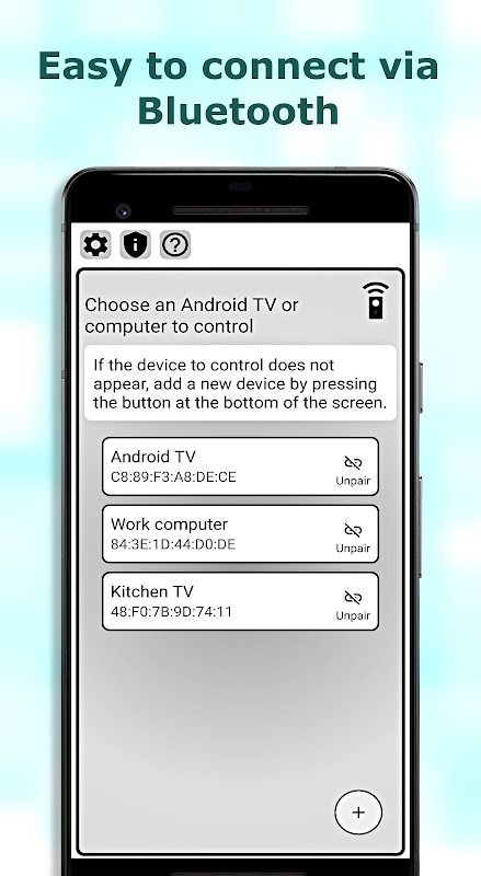 Loại bỏ nhiều điều khiển từ xa và tận hưởng khả năng điều khiển TV thuận tiện bằng điện thoại của bạn! Tải xuống Bluetooth Android TV Remote ngay bây giờ và nâng cao trải nghiệm TV của bạn.