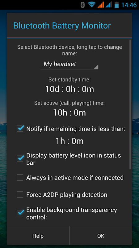 Bluetooth Battery Monitor - là một ứng dụng widget chỉ cung cấp cho bạn với một mức độ pin ước tính của tai nghe bluetooth của bạn (hoặc thiết bị khác) và tính toán bao nhiêu thời gian còn lại của pin của nó. Để tính toán các giá trị, widget theo dõi hoạt động thiết bị Bluetooth của bạn và sử dụng Active thời gian và thời gian chờ mà bạn nên nhập trên màn hình cấu hình. Bạn có thể lấy các giá trị từ hướng dẫn sử dụng hoặc thông số kỹ thuật của thiết bị Bluetooth của bạn, hoặc sử dụng phụ tùng chính để đếm thời gian hoạt động cho bạn.