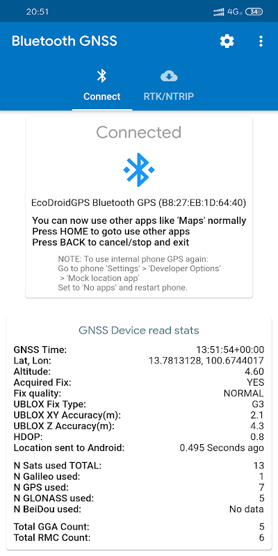 Đối với các thiết bị dựa trên u-blox, ứng dụng này cũng hỗ trợ hiển thị ước tính 'Độ chính xác' từ thông báo độ chính xác của U-Blox 'PUBX', thay vì phương pháp 'HDOP x CEP' thường được sử dụng. Việc đọc độ chính xác của PUBX này khớp chính xác với cùng một nguồn 'Độ chính xác' như được hiển thị trong công cụ U-Center PC khi được kết nối trực tiếp qua USB.