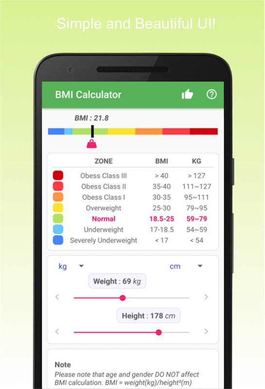 * Theo Viện Tim, Phổi và Máu Quốc gia (NIH), phạm vi BMI bình thường là 18,5 ~ 25. Để duy trì mức BMI này là rất tốt cho cuộc sống khỏe mạnh.