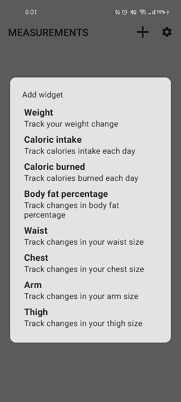 Body Measurement and Weight Loss Tracker is customizable allowing you to track any body measurement you can think of and ignore the ones you are not interested in. The following measurements are included by default: