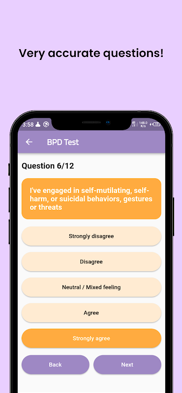 Có được sự rõ ràng và hiểu biết sâu sắc về sức khỏe tinh thần của bạn với ứng dụng Kiểm tra Rối loạn Nhân cách Ranh giới được thiết kế khoa học của chúng tôi. Công cụ đánh giá toàn diện này được phát triển đặc biệt để đánh giá sự hiện diện của các triệu chứng Rối loạn Nhân cách Ranh giới (BPD).