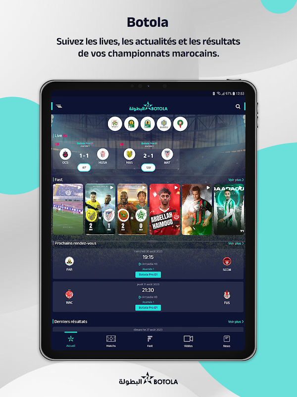 Tải xuống ứng dụng Botola miễn phí trên điện thoại thông minh hoặc máy tính bảng của bạn, ứng dụng chính thức đầu tiên và duy nhất đưa bạn vào trung tâm của Giải vô địch bóng đá Botola Ma-rốc