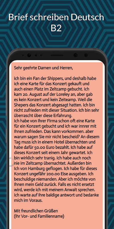 Trong Ứng dụng Ứng dụng Tóm tắt schreiben Deutsch B2 tìm thấy Sie einige Beispiele für B2-Briefe zur Vorbereitung auf Prüfungen trong deutscher Sprache. Es wird die beste Praxis für Sie und auch für die Prüfung sein. Hier findest du Briefe zu verschiedenen Themen und lernst, wie du Briefe für die B2-Prüfung richtig schreibst.