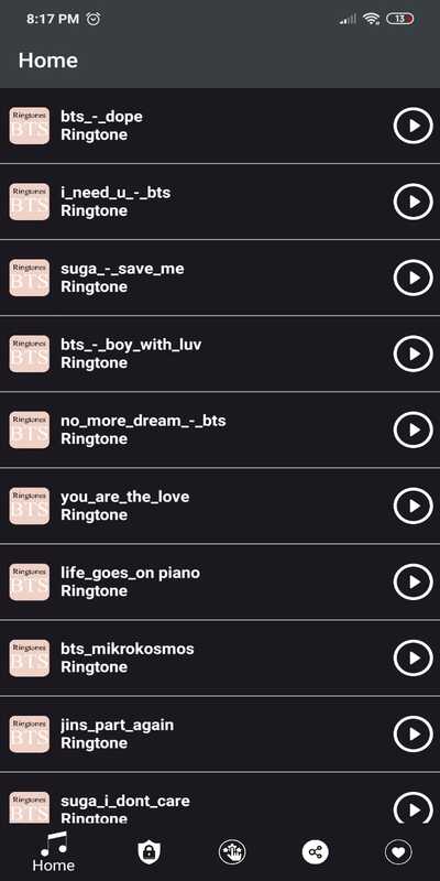 esta aplicación incluye una gran colección de tonos de btskpop totalmente gratis para tu celular. también puedes descargar y compartirlos con tus contactos de forma facil. Nuestra aplicación te permite crear una lista con tus favoritos y cambiarlos cuando prefiera.