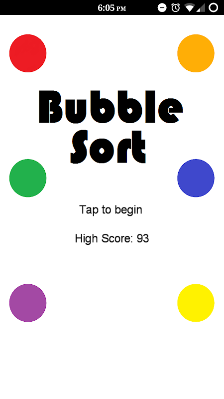 Bubble Sort is a simple game. By simple I mean EXTREMELY simple. Bubbles fall from the top of the screen. These bubbles are red, green, blue, purple, orange, or yellow. All you have to do is drag each bubble to the same colored circle. If a bubble reaches the bottom or you sort one into the wrong place, you lose. Simple as that.