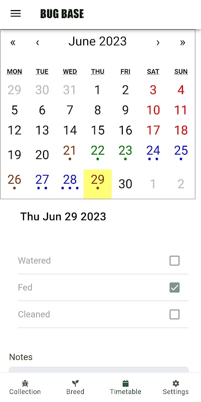 - Sử dụng lịch tích hợp để ghi lại thói quen cho ăn, làm sạch và tưới nước cho động vật không xương sống của bạn.