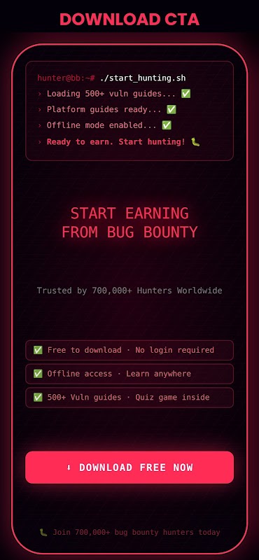 Bug Bounty là ứng dụng miễn phí đầy đủ nhất để làm chủ hacking đạo đức và an ninh mạng từ đầu. Cho dù bạn là người mới bắt đầu hay chuyên gia kiểm thử xâm nhập giàu kinh nghiệm nhắm mục tiêu vào HackerOne, Bugcrowd và Synack — ứng dụng này bao gồm hacking đạo đức, kiểm thử xâm nhập, bảo mật ứng dụng web và các chiến lược kiếm tiền thực sự, mọi lúc, mọi nơi.