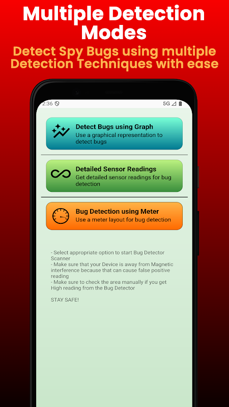 Máy quét phát hiện côn trùng gián điệp này có những hạn chế riêng và kết quả đo của cảm biến từ kế phụ thuộc vào thiết bị cụ thể bạn đang sử dụng. Cần có sự can thiệp của con người để có kết quả chính xác. Nếu kết quả đo của máy quét cao, bạn nên kiểm tra thủ công khu vực đó để tìm bất kỳ côn trùng gián điệp ẩn nào.