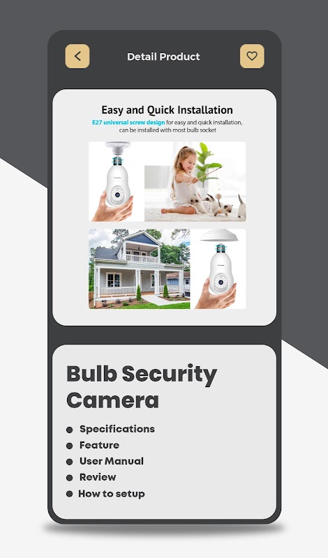 Bạn đang tìm kiếm thông tin về sản phẩm Camera An Ninh LaView Bulb? thì ứng dụng này có thể giúp bạn có được thông tin chi tiết về Camera an ninh Bulb, cách sử dụng và phát huy tối đa tất cả các tính năng hiện có. Trong ứng dụng hướng dẫn Camera an ninh bóng đèn này, bạn sẽ nhận được các thông tin như thông số kỹ thuật của Camera an ninh bóng đèn, tính năng và chi tiết của sản phẩm, cách thiết lập Camera an ninh bóng đèn và đánh giá thông tin về sản phẩm.