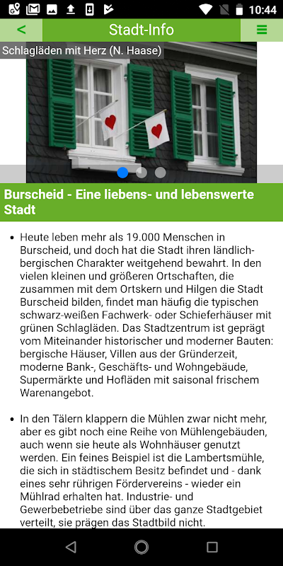 Mit der offiziellen Burscheid-App erhalten Sie ausführliche Informationen über die Stadt, einen übersichtlichen Rathaus-Wegweiser, nützliche Hinweise zu Sehenswürdigkeiten, interessante Kultur-, Freizeit- und Sportangebote, ein regionales Branchenbuch und ein umfangreiches Ärzteverzeichnis sowie aktuelle Nachrichten und Veranstaltungshinweise. Ob Sie die App als Bürger, Neubürger, Gast oder als Unternehmer bzw. Freiberufler nutzen - Sie sind stets auf dem Laufenden.