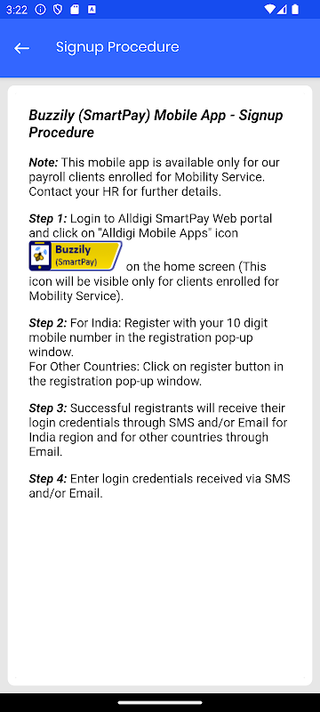 Buzzily (SmartPay) là một Ứng dụng hợp nhất và là một tính năng mở rộng của cổng thông tin Tự phục vụ nhân viên Smartpay (ESS) giúp nhân viên truy cập Thông tin tiền lương của họ khi đang di chuyển. Các tính năng và chức năng của ESS bị hạn chế trong kênh phân phối này. Quyền truy cập vào dịch vụ này được cung cấp dựa trên giải pháp HRO được cung cấp như một phần dịch vụ của chúng tôi cho chủ lao động của bạn.