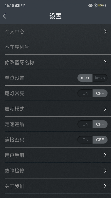 Byte là một APP do KCQ phát triển để điều khiển xe tay ga điện. Kết nối xe tay ga điện thông qua Bluetooth của điện thoại di động. Sau khi kết nối thành công, tốc độ, công suất, trạng thái đèn, vị trí bánh răng, tổng quãng đường đã đi và quãng đường hiện tại, thời gian đi xe , chế độ khởi động và các thông tin khác của xe dao không thể lấy được trên APP di động. Và bạn có thể điều khiển bánh răng, đèn, chế độ hành trình, chế độ khởi động, v.v. trên APP điện thoại di động, bạn cũng có thể sửa đổi tên Bluetooth của xe, bật tắt mật khẩu xe, trong phần cài đặt có thể xem tình trạng lỗi của xe để tiện cho việc bảo dưỡng.