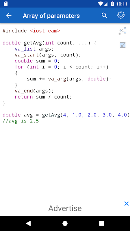 ✓ Học cú pháp C++ trên các ví dụ mã cụ thể. Làm thế nào để lấy một chuỗi con? Làm thế nào để khai báo một phương pháp tổng quát? Những mã này và hơn 300 mẫu mã khác cho C++ có sẵn trong ứng dụng.