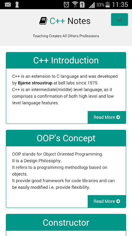 I am representing an Android Application name C++. Basically i have created this application for the students, who are pursuing the computer course related to computer application field and purpose of this application is to make them clear about all the basic concept of this field.