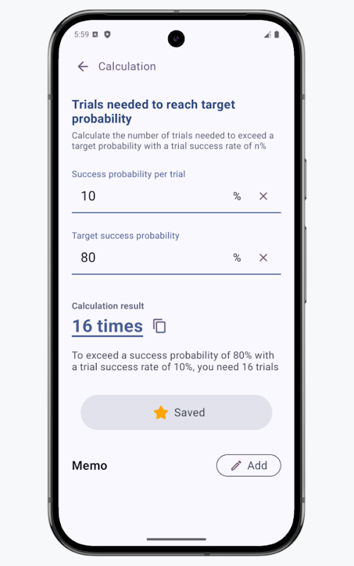 Với ứng dụng này, bạn có thể dễ dàng tính toán số lần thử để có cơ hội thành công cao dựa trên xác suất bạn đặt ra.