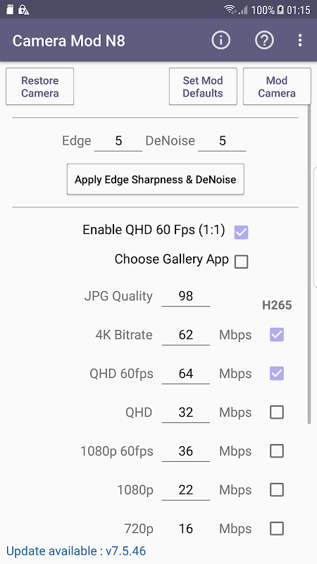 Mod N8 Camera, H265 / HEVC Mode, QHD @ 60fps, HDR 4K, Tốc độ bit, độ sắc nét [ROOT]