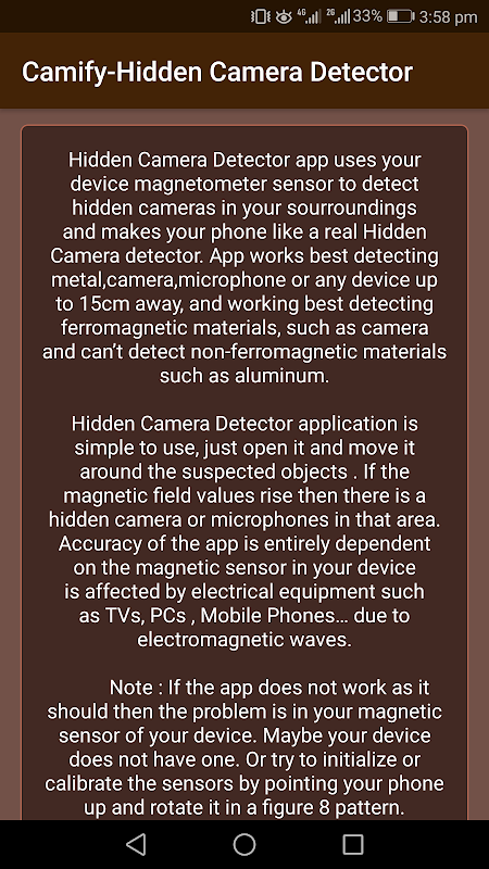 camera detector app protect your privacy from spy hidden camera lenses.Camera Detector app works best detecting all metal cameras up to 15 cm away from your device, and working best detecting ferromagnetic materials, such as detect camera and it can’t detect non-ferromagnetic materials such as aluminum or other material.