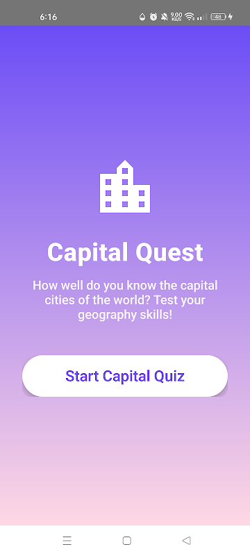 Capital Quest là một trò chơi đố vui hấp dẫn và mang tính giáo dục, được thiết kế để kiểm tra kiến thức của bạn về các thủ đô trên thế giới. Với hàng trăm câu hỏi được tuyển chọn kỹ lưỡng, bao gồm các quốc gia từ khắp các châu lục, ứng dụng này mang đến một cách thú vị và đầy thử thách để cải thiện kỹ năng địa lý của bạn. Cho dù bạn là học sinh, du khách hay chỉ đơn giản là một người đam mê đố vui, Capital Quest đều mang đến trải nghiệm tương tác giúp việc học trở nên thú vị.